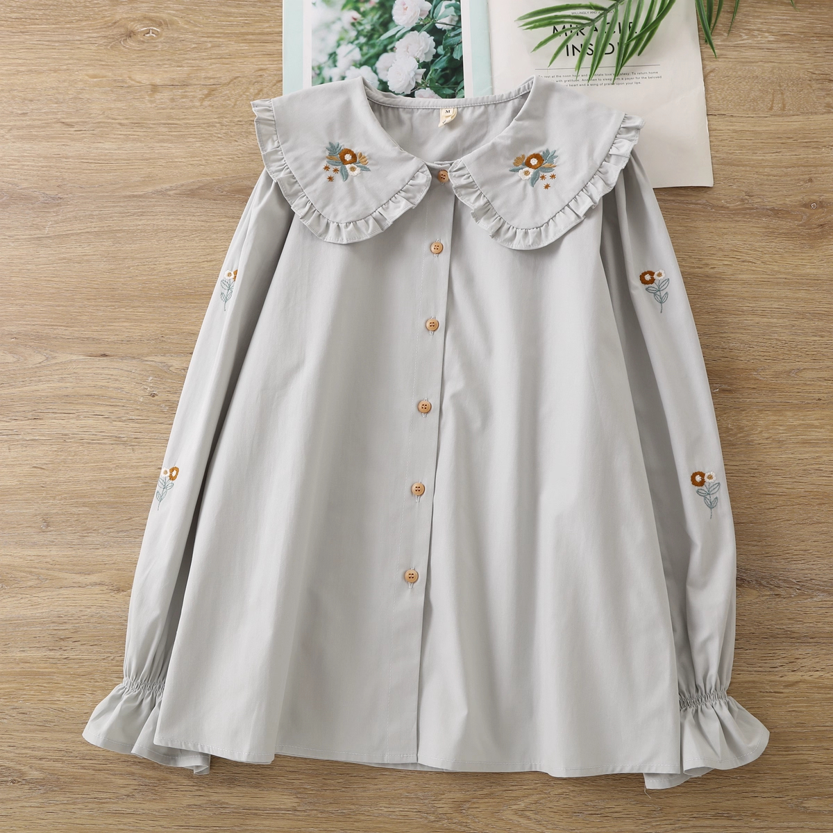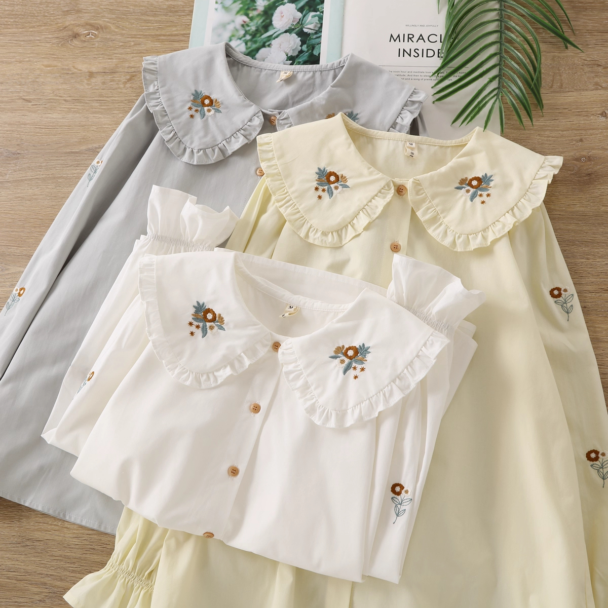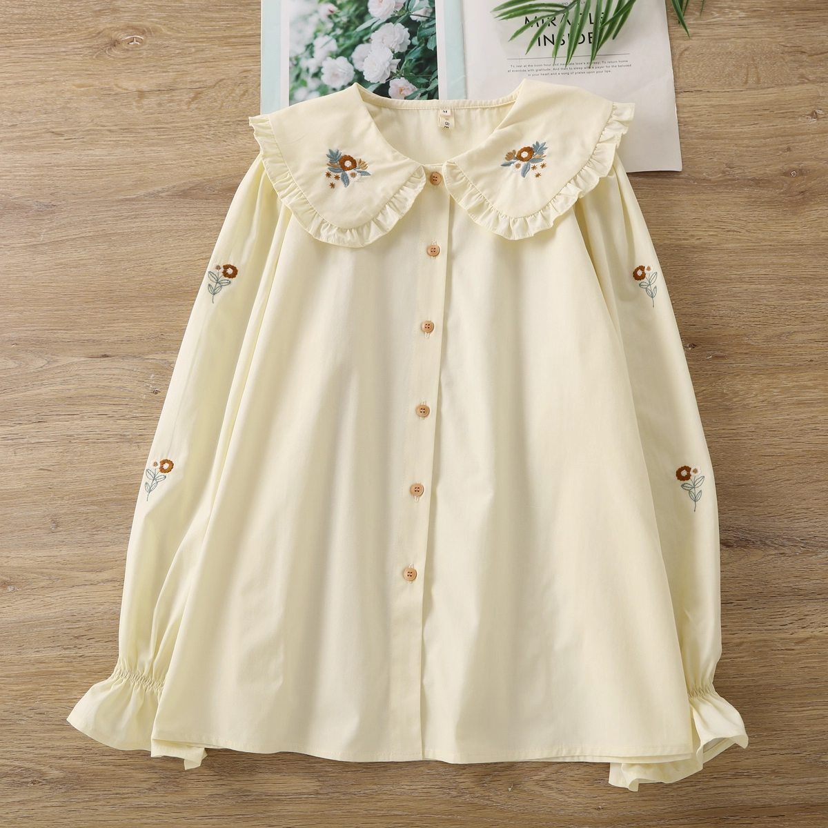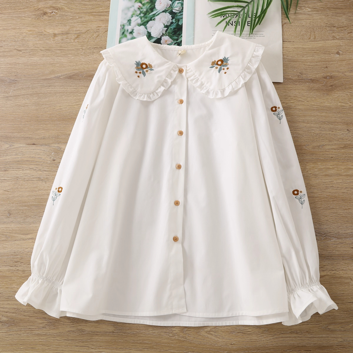 O cămașă delicată și feminină, cu guler volanat brodat și mâneci lejere, creată să aducă un strop de lumină în garderoba ta. ✨
