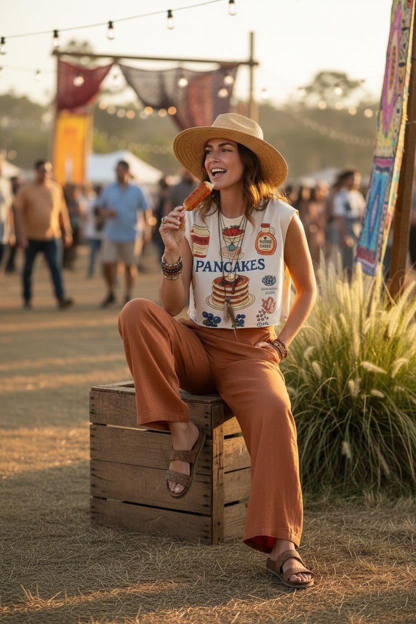 Top crop din bumbac, cu print „Pancakes” integrat în material, într-un stil playful și relaxat. One size, perfect pentru outfituri boho, casual sau festival.