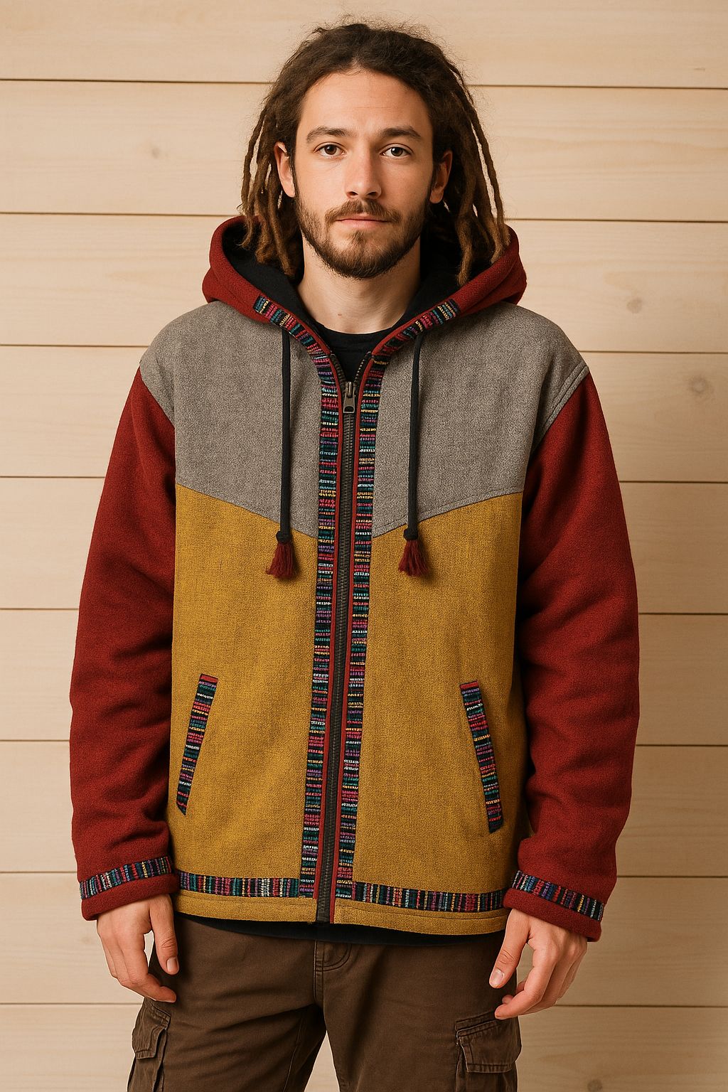 Designul în blocuri de culori — muștar, burgundy și gri natural — oferă un look modern-hippie , în timp ce motivele multicolore din jurul glugii, fermoarului, buzunarelor și manșetelor adaugă personalitate și energie . Geaca are o croială ușor oversize, fiind potrivită atât pentru femei, cât și pentru bărbați.