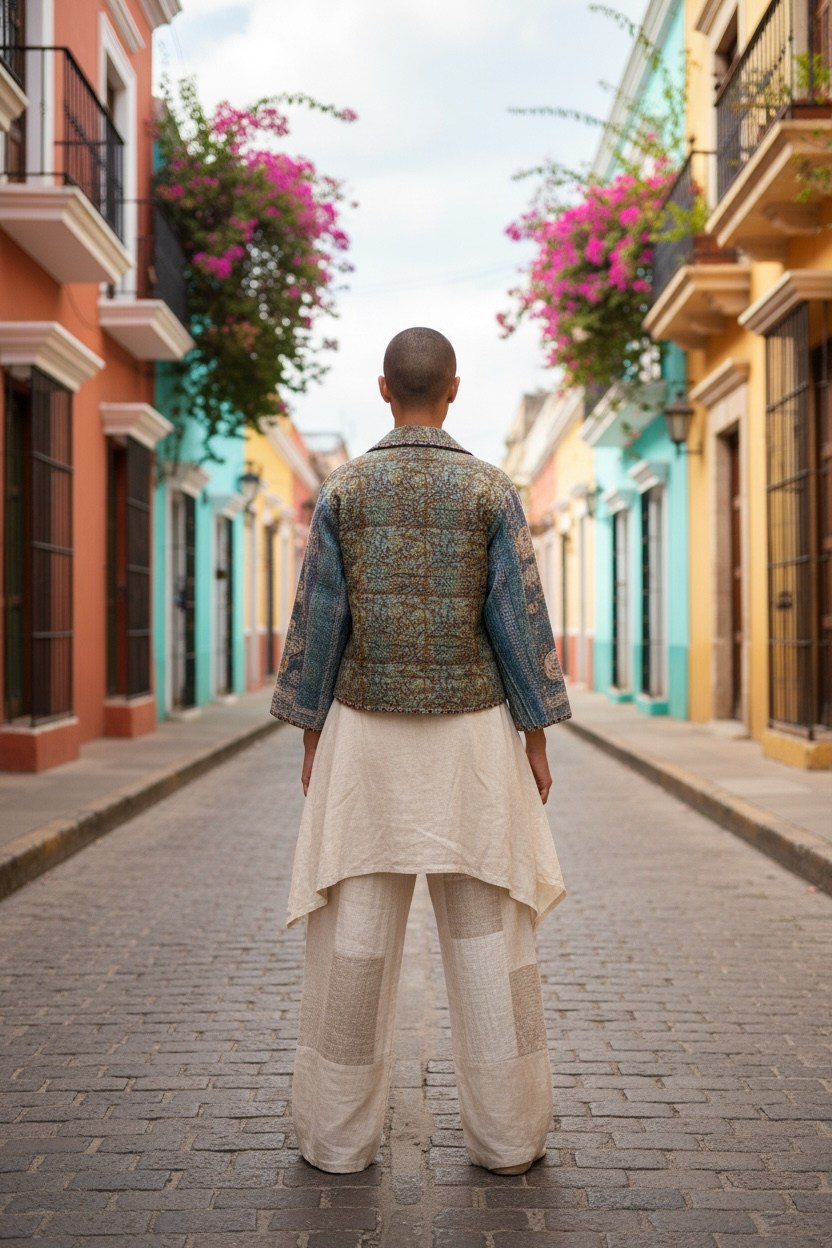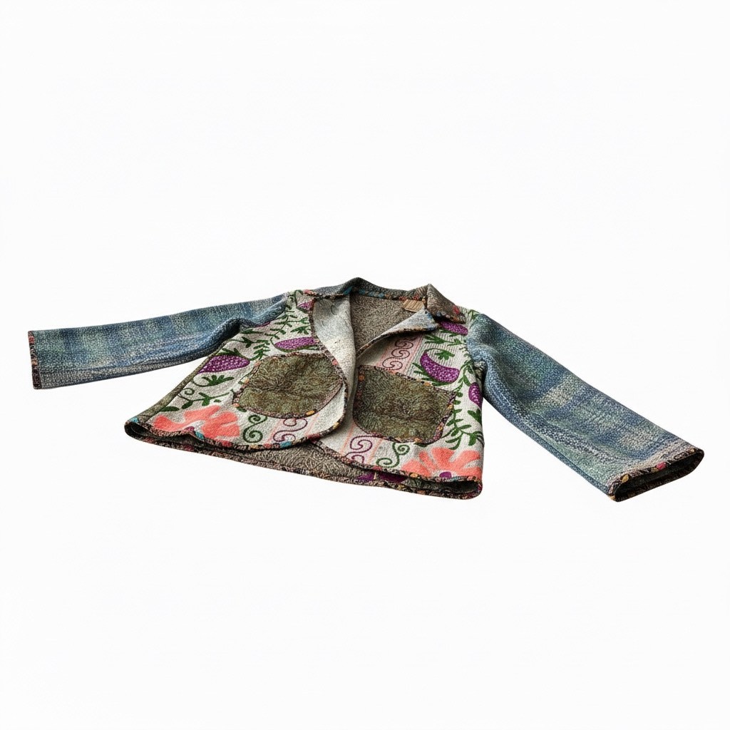 Jacheta „Garden Vintage” este o piesă cu identitate puternică, creată din materiale textile reinterpretate, cu influențe tradiționale și accente artistice.