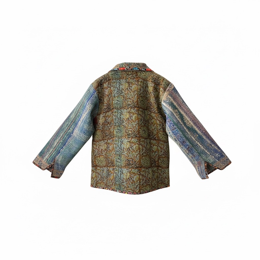 Realizată manual din carpetă vintage, această jachetă păstrează frumusețea motivelor originale și le transformă într-o formă modernă, ușor de purtat. Texturile diferite și combinațiile de imprimeuri creează un contrast unic, care atrage imediat privirea.