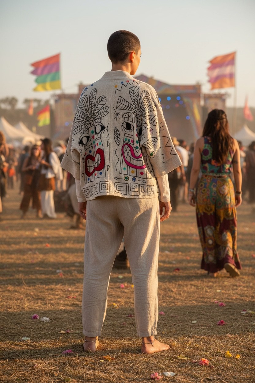 Un kimono cu vibe liber și autentic, lucrat manual din cânepă și bumbac, brodat cu simboluri artistice și expresive. Piesă unicat, one size, creată pentru suflete care nu urmează reguli, ci își creează propriul drum.
