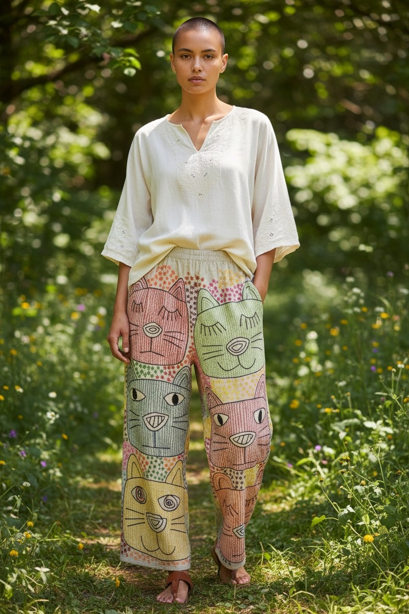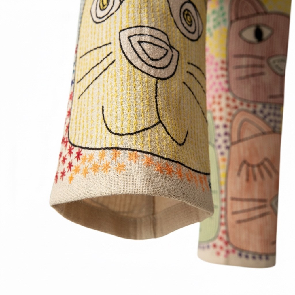 Pantaloni din pânză de bumbac, brodați manual cu fețe de pisici colorate. Piesă unicat, croi lejer, perfectă pentru un stil relaxat, artistic și plin de personalitate.