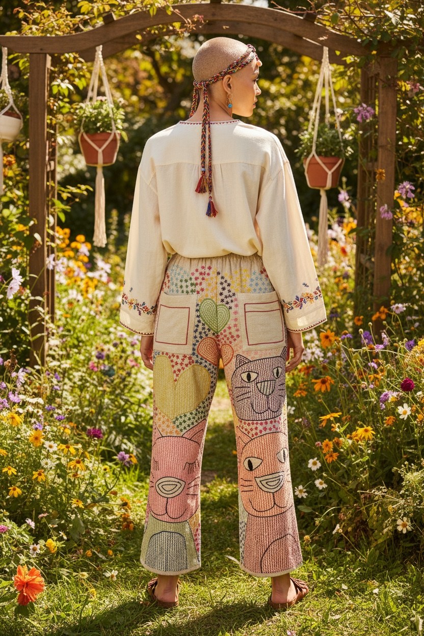 Broderiile colorate cu fețe de pisici transformă acești pantaloni într-o piesă care transmite instant o stare – relaxată, creativă și ușor nonconformistă. Fiecare detaliu este lucrat manual, ceea ce face ca fiecare centimetru să aibă personalitate.