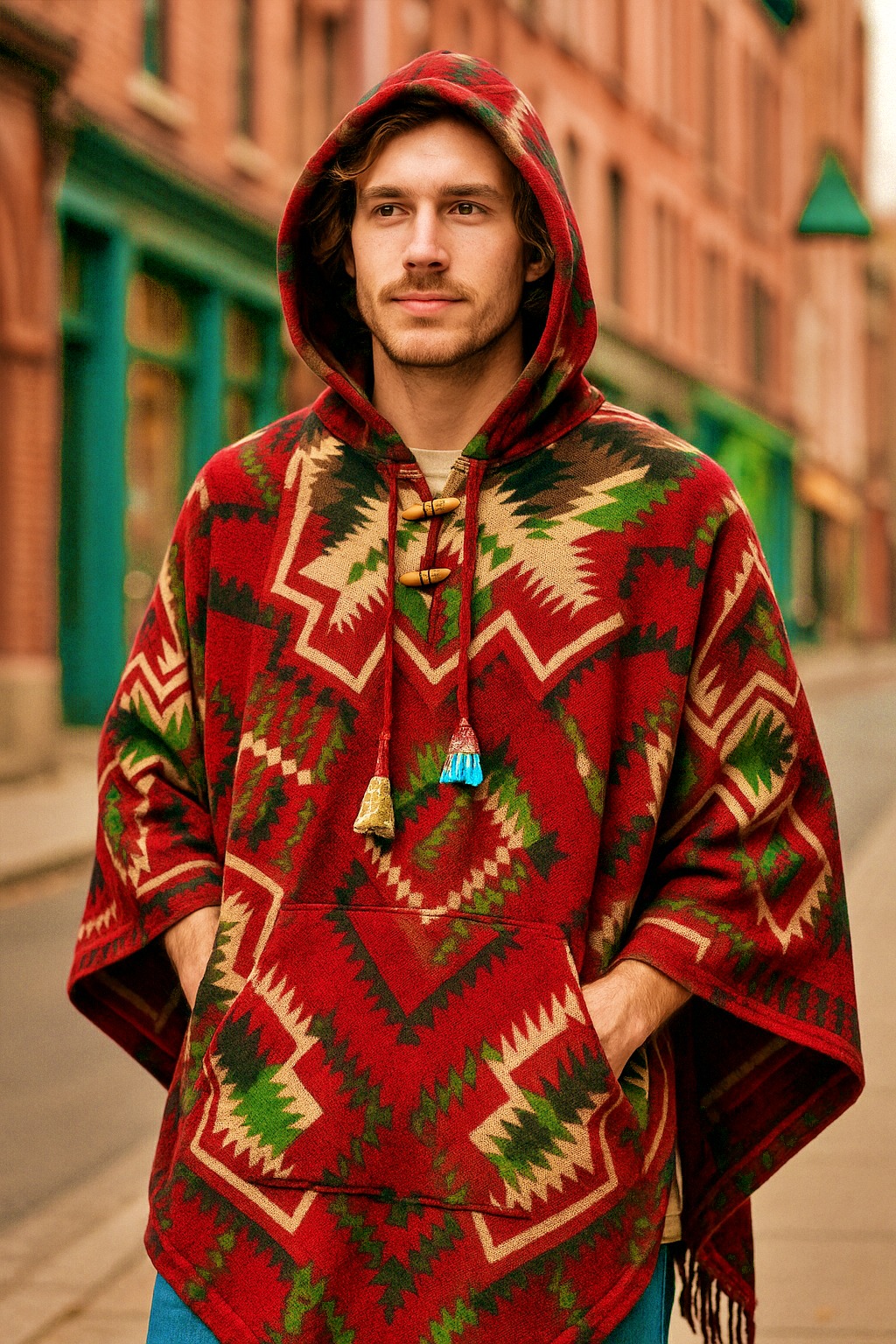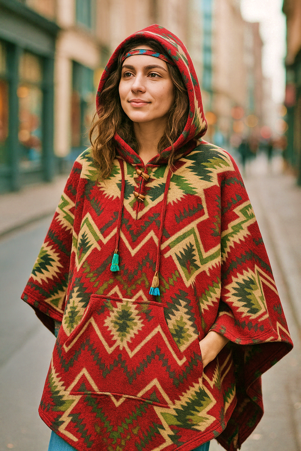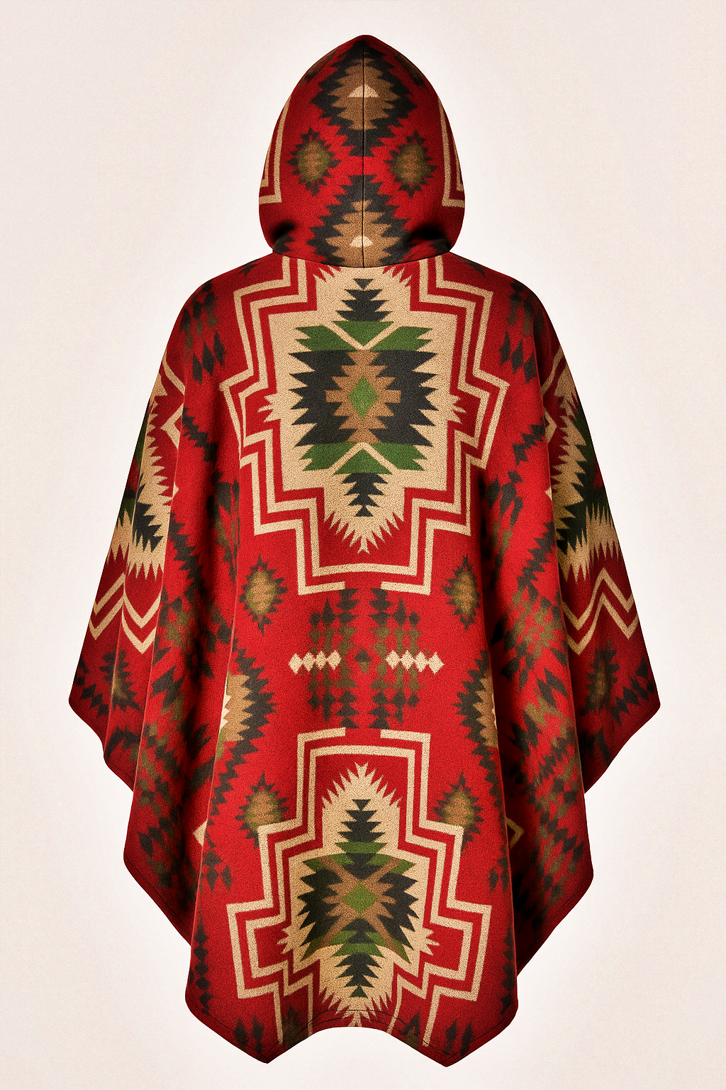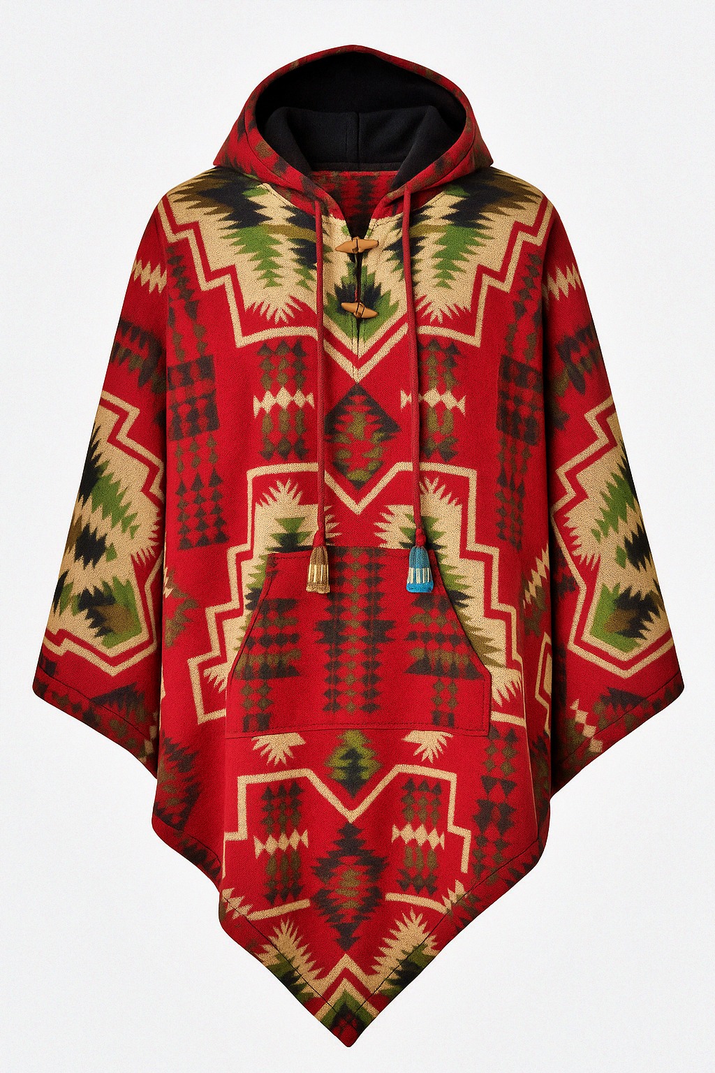 Poncho etnic unisex, gros și călduros, cu glugă polar , nasturi din lemn și buzunar frontal. Model geometric inspirat din motive himalayene, perfect pentru iarnă, festivaluri și stil hippie-urban.