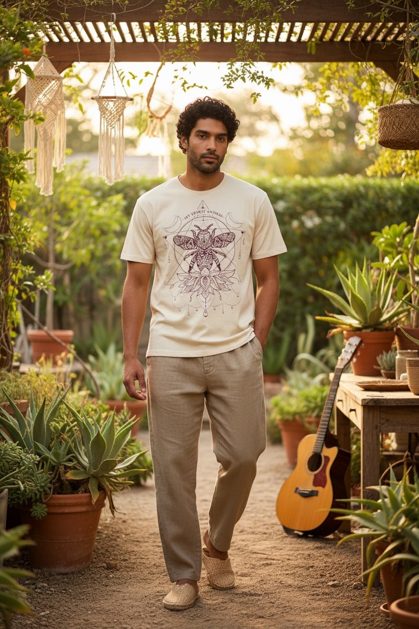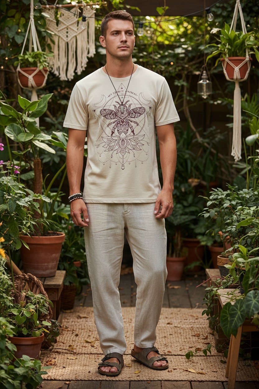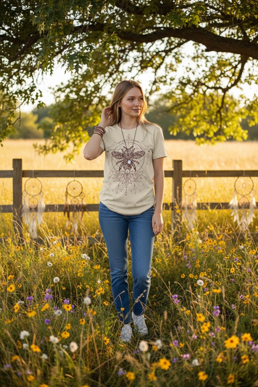 Tricoul „Spirit Bee” este o piesă cu simbolism profund, inspirată de echilibru, natură și energie interioară. Designul detaliat, cu albina centrală și elemente geometrice sacre, transmite ideea de armonie și conexiune cu sinele.