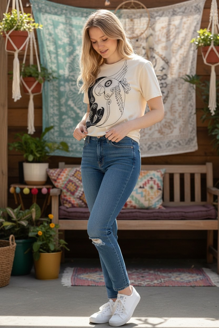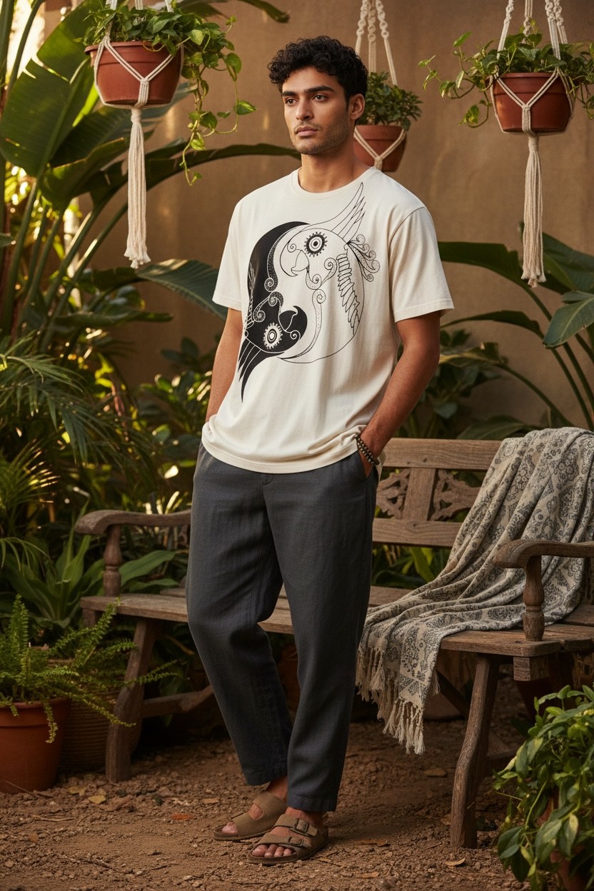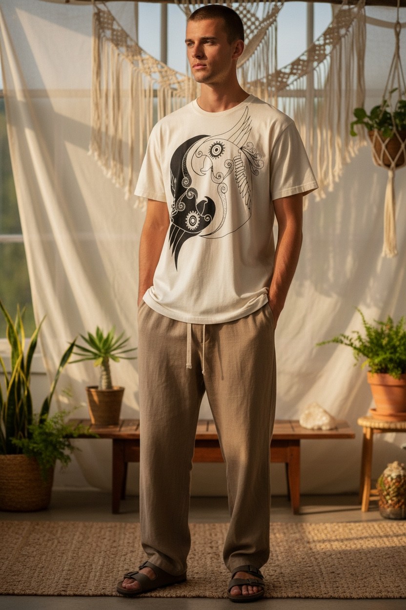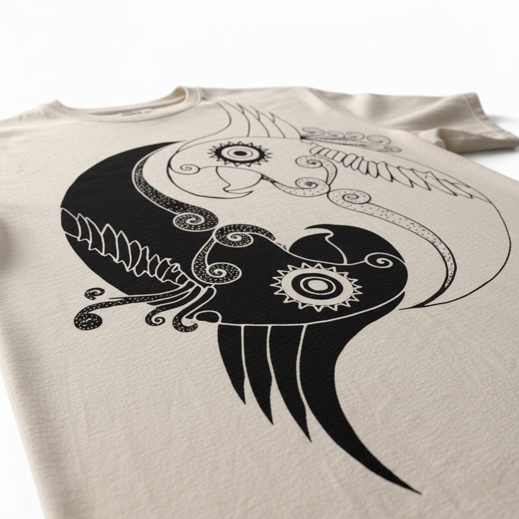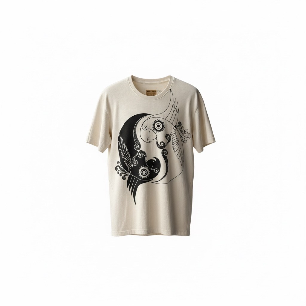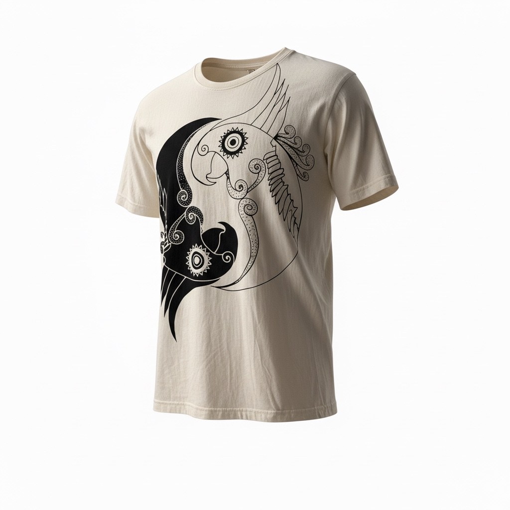 Tricoul „Yin Yang Parrot” îmbină simbolistica echilibrului cu energia libertății. Designul artistic prezintă doi papagali integrați într-o compoziție de tip yin-yang, sugerând armonia dintre contraste: lumină și întuneric, calm și energie, interior și exterior.