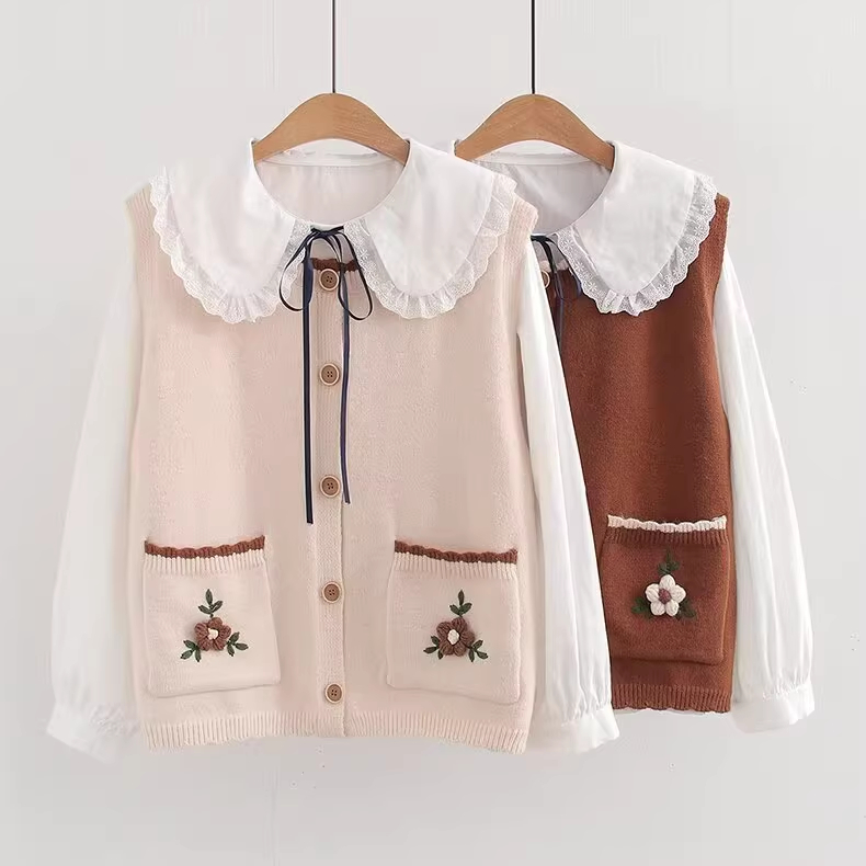 Această vestă tricotată este piesa care schimbă instant orice ținută, adăugând un aer romantic, cald și feminin. Gulerul amplu din dantelă, legat cu o panglică subțire, creează un look delicat, inspirat din moda vintage japoneză, iar buzunarele brodate aduc un plus de personalitate și finețe.