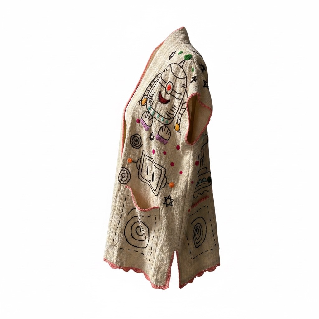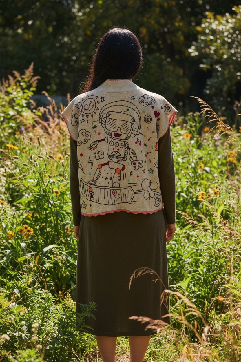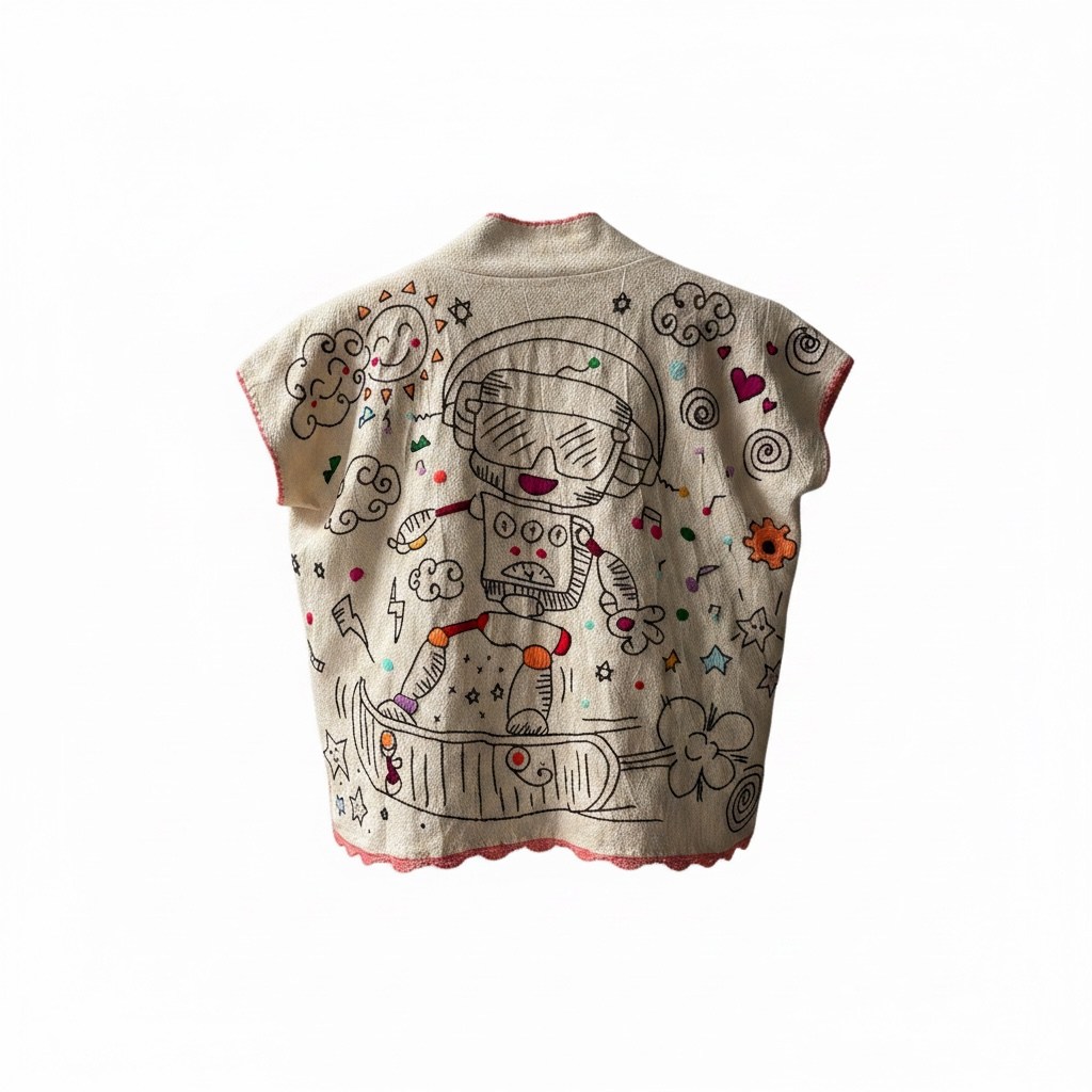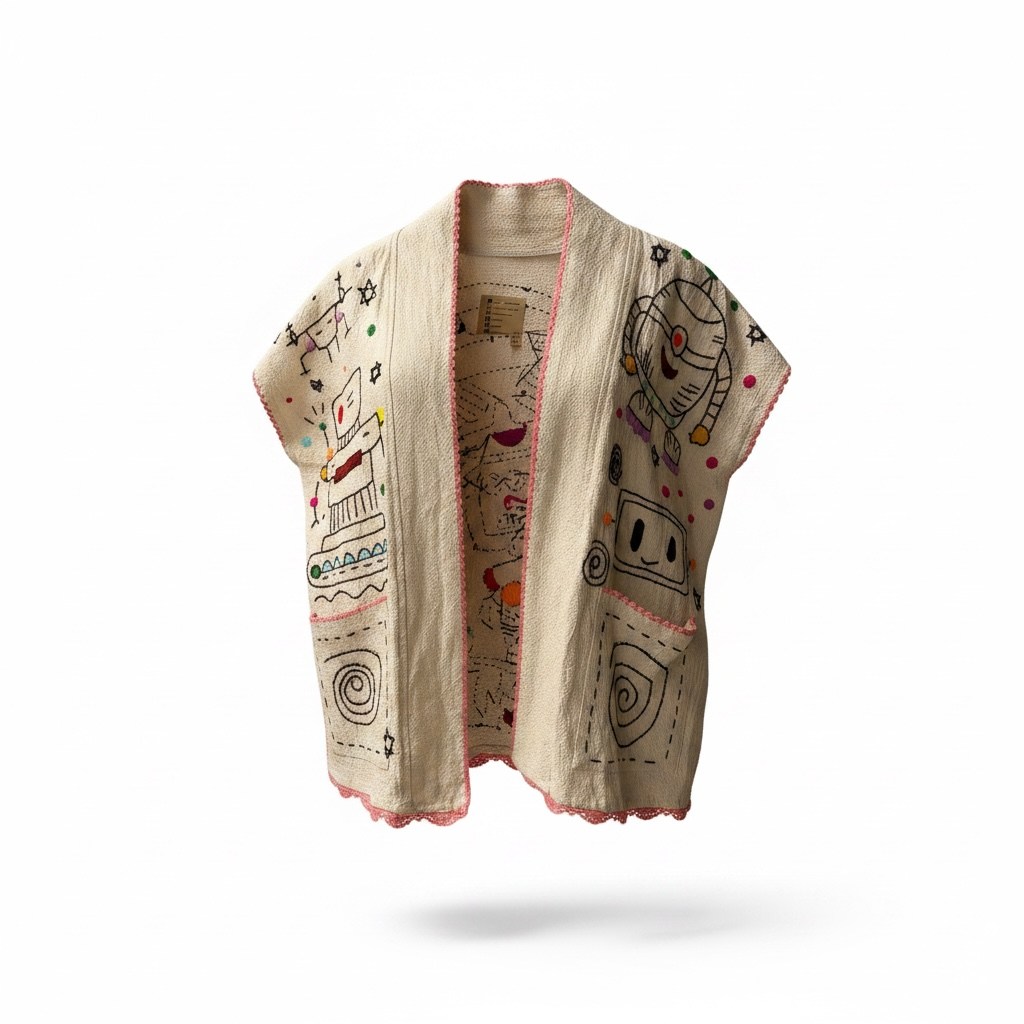 Vestă handmade din cânepă și bumbac, brodată manual cu un design jucăuș și urban. Piesă unicat, lejeră și expresivă, creată pentru cei care ies din tipare.